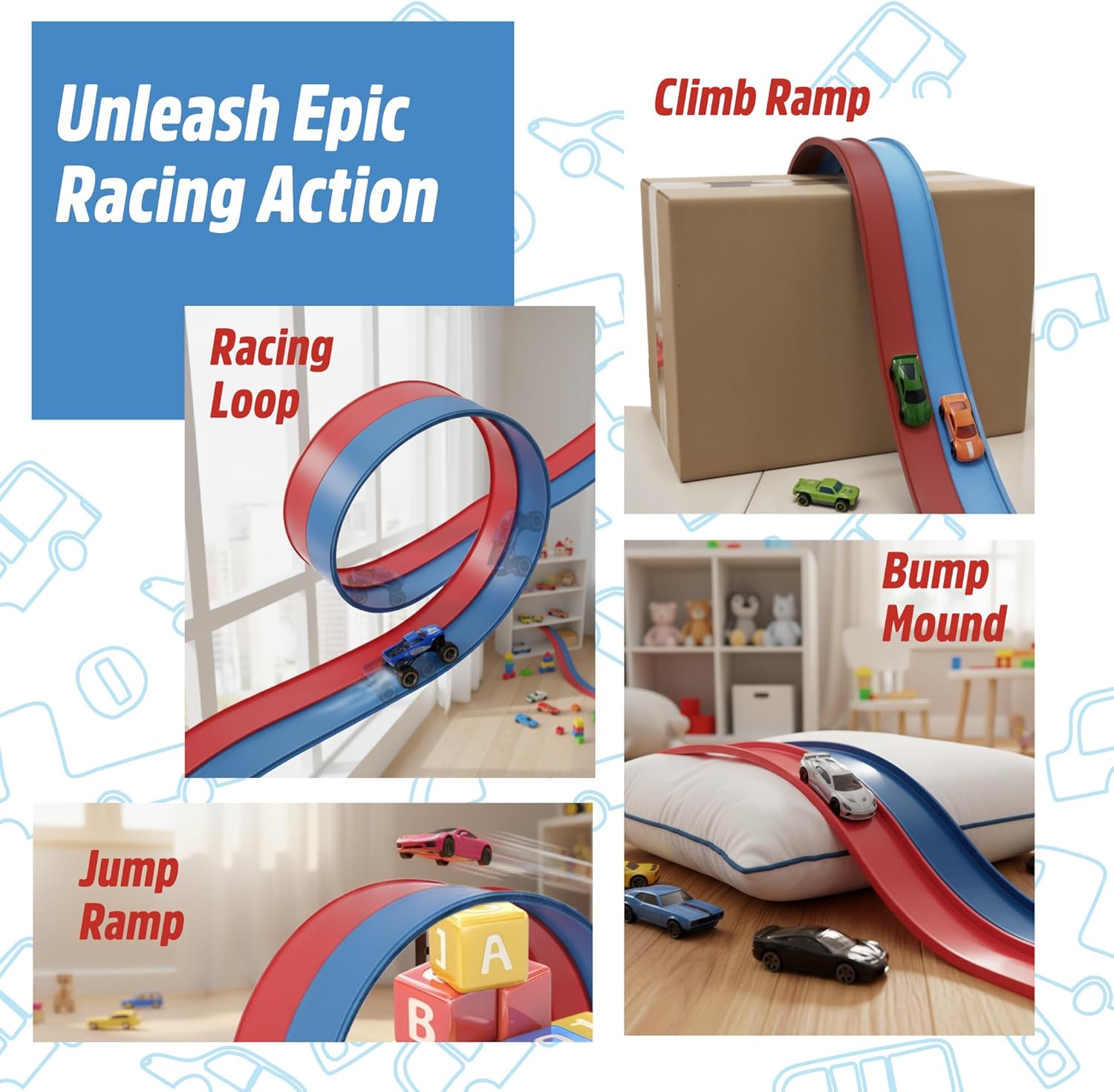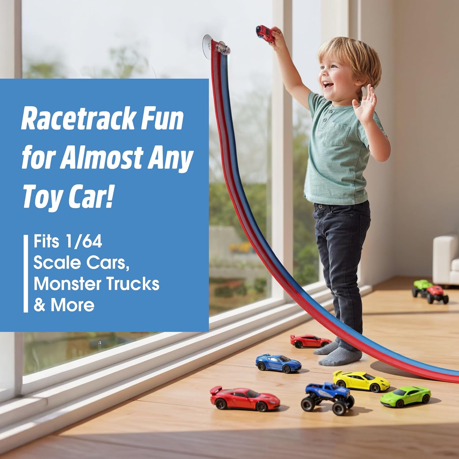 - Compatible with 1/64 Scale Cars & More: Designed to work with 1/64 scale vehicles, the CuteGrin Flexible Race Track for Kids is a natural fit for Hot Wheels, die-cast Monster Truck, Matchbox cars, and other small toy vehicles. The dual blue and red flex track design lets children race side by side, test their favorites head-to-head, or experiment with marbles. Broad compatibility creates endless racing challenges while maximizing play value, making it an ideal starter set for young racing fans.
