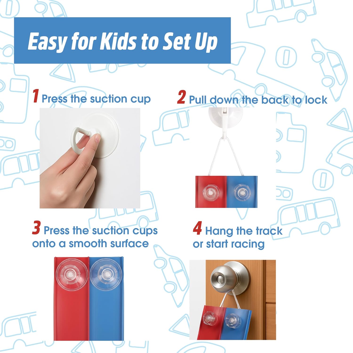 - Strong Suction Cups for Vertical & Flat Surfaces: Equipped with powerful suction cups, the CuteGrin Flexible Race Car Track attaches securely to smooth surfaces including windows, tiles, tables, and refrigerators. Children can design horizontal speed runs or daring vertical climbs without worrying about slippage. The strong hold ensures the track stays in place through every race, providing steady performance and continuous fun.